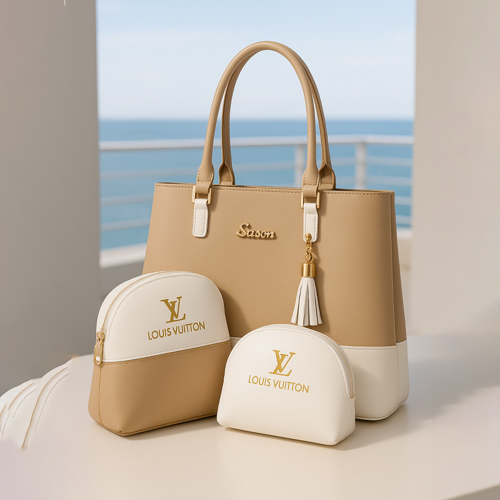Elevate your everyday style with the Boom Two-Tone Tote — a sophisticated blend of modern design and timeless elegance. Featuring a soft beige upper contrasted with a crisp white lower half, this structured tote is accented with polished gold hardware and a bold “Boom” logo in cursive script. The dual top handles ensure a comfortable carry, while the spacious interior offers ample room for daily essentials. Perfect for workdays or weekend outings, this tote balances fashion and function with ease. Color: Beige & White. Material: Faux leather. Details: Gold-tone hardware, Boom logo. Use: Everyday tote, work bag, casual outings. ~16–18″ wide.